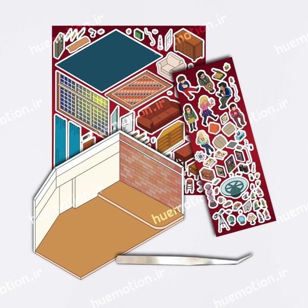 پک استیکر سه بعدی شامل کارت اتاق، استیکر ها، نقشه پیشنهادی طرح و پنس برای چسباندن راحت تر استیکر ها است.